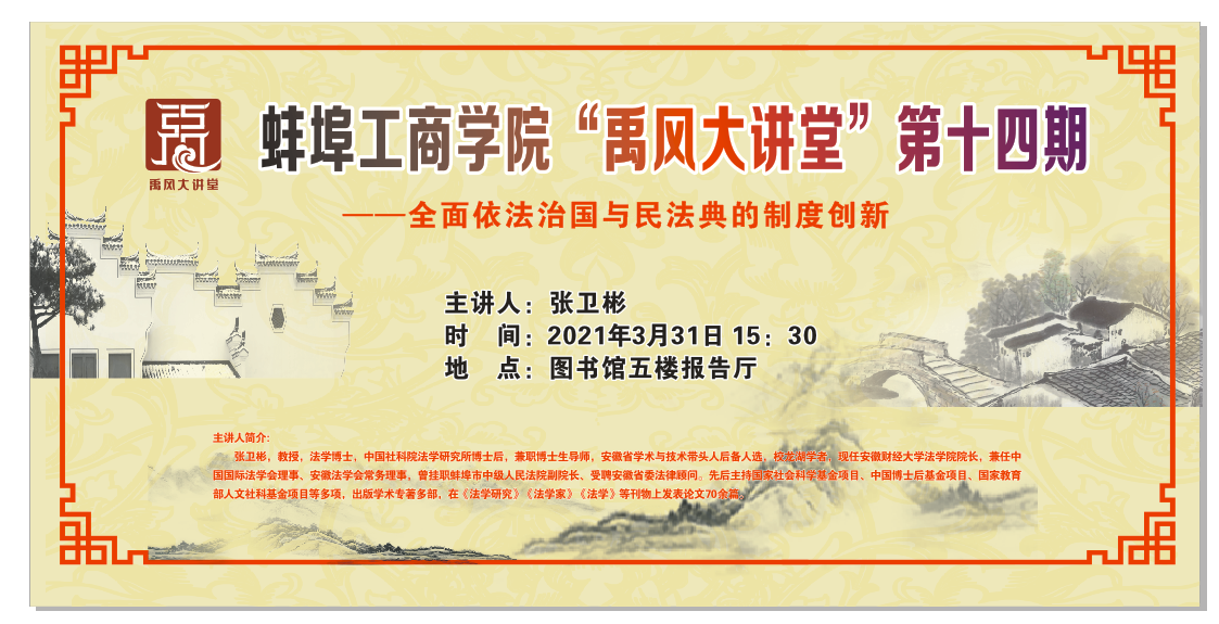 主讲人简介:张卫彬,教授,法学博士,中国社科院法学研究所博士后,兼职博士生导师,安徽省学术与技术带头人后备人选,校龙湖学者,现任安徽财经大学法学院院长,兼任中国国际法学会理事、安徽法学会常务理事,曾挂职蚌埠市中级人民法院副院长、受聘安徽省委法律顾问。先后主持国家社会科学基金项目、中国博士后基金项目、国家教育部人文社科基金项目等多项,出版学术专著多部,在《法学研究》《法学家》《法学》等刊物上发表论文70余篇。