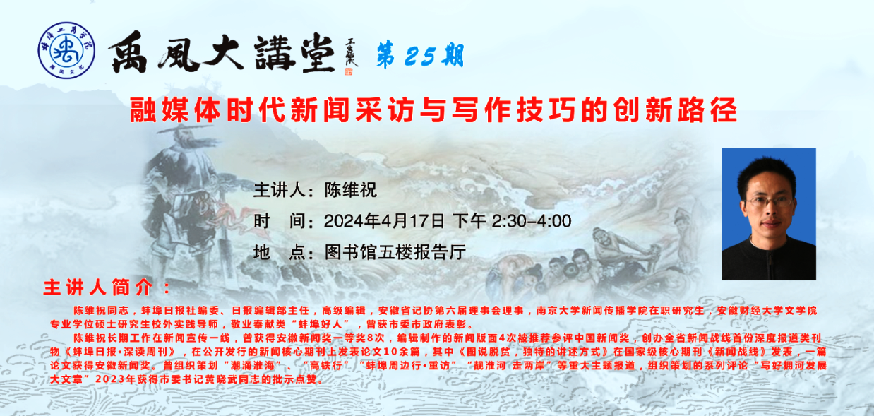 主讲人简介:陈维祝同志,蚌埠日报社编委、日报编辑部主任,高级编辑,安徽省记协第六届理事会理事,南京大学新闻传播学院在职研究生,安徽财经大学文学院专业学位硕士研究生校外实践导师,敬业奉献类“蚌埠好人”,曾获市委市政府表彰。