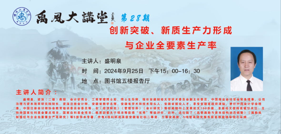 主讲人简介:盛明泉,资深(二级)教授,会计学博士,工商管理博士后,博士生导师,现任安徽财经大学学术委员会副主任委员,中国商业会计学会常务理事,公司治理与资本效率研究院院长,资深注册会计师,安徽省教学名师,安徽省学术和技术带头人,安徽省拔尖人才,享受安徽省政府津贴。曾任中国会计学会理事,中国注册会计师协会教育培训委员会委员等。在《经济研究》《管理世界》《会计研究》等权威期刊上发表论文100余篇,多篇论文获得高被引关注。主持的国家社科基金重点项目、国家自科基金项目、教育部重大子项目等获得“优秀”等级评价。此外,还出版了《高管激励与资本结构动态调整》《激励机制错位与企业全要素生产率研究》等5部学术专著,并有4项科研成果获安徽省社科二等奖、三等奖奖励,5项智库研究报告获省部级领导批示采纳。