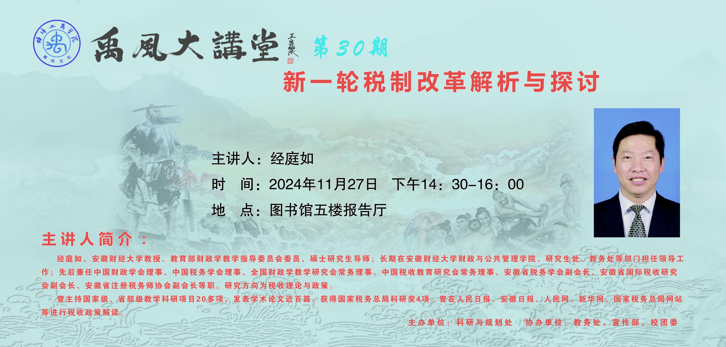 主讲人简介:经庭如,安徽财经大学教授、教育部财政学教学指导委员会委员、硕士研究生导师;长期在安徽财经大学财政与公共管理学院、研究生处、教务处等部门担任领导工作;先后兼任中国财政学会理事、中国税务学会理事、全国财政学教学研究会常务理事、中国税收教育研究会常务理事、安徽省税务学会副会长,安徽省国际税收研究会副会长、安徽省注册税务师协会副会长等职。研究方向为税收理论与政策。曾主持国家级、省部级教学科研项目20多项,发表学术论文近百篇。获得国家税务总局科研奖4项。曾在人民日报、安徽日报、人民网、新华网、国家税务总局网站等进行税收政策解读。