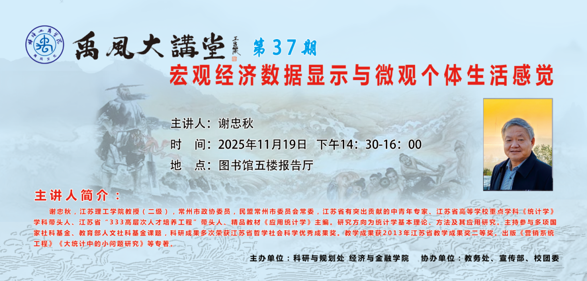 主讲人简介:谢忠秋,江苏理工学院教授(二级),常州市政协委员,民盟常州市委员会常委,江苏省有突出贡献的中青年专家、江苏省高等学校重点学科《统计学》学科带头人、江苏省“333高层次人才培养工程”带头人、精品教材《应用统计学》主编。研究方向为统计学基本理论、方法及其应用研究。主持参与多项国家社科基金、教育部人文社科基金课题,科研成果多次荣获江苏省哲学社会科学优秀成果奖。教学成果获2013年江苏省教学成果奖二等奖。出版《营销系统工程》《大统计中的小问题研究》等专著。
