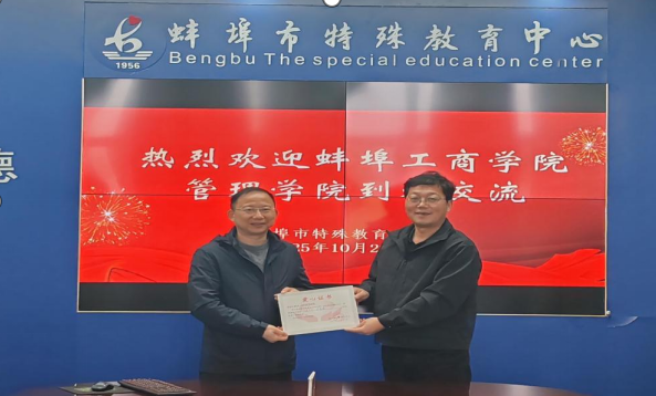 与此同时,阮进兵书记、赵骏书记与蚌埠特殊教育中心领导围绕今后合作交流事宜展开深入探讨。双方一致表示,将进一步加强沟通协作,整合资源优势,共同为特殊儿童的健康成长、全面发展搭建更好的平台,贡献更多力量。活动最后,蚌埠特殊教育中心向管理学院授予爱心证书,以表彰学院此次爱心之举,感谢学院为特殊儿童带来的温暖与关怀。